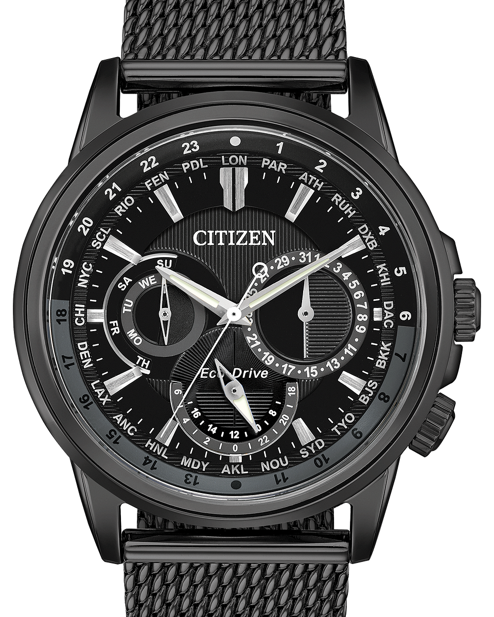 Black dial with world time in 24 cities. Your watch should be used in accordance with these advisories at all times to ensure optimal enjoyment. This product is sold out. Water resistant to 10 atm. Bring sophistication to your day with the citizen calendrier.